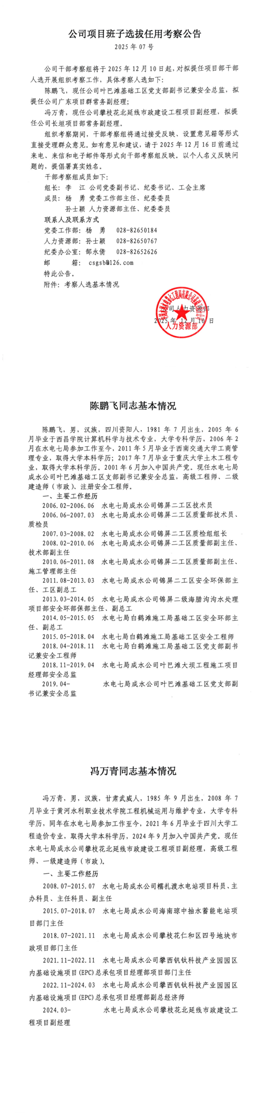 公司项目班子选拔任用考察公告(2025年07号)