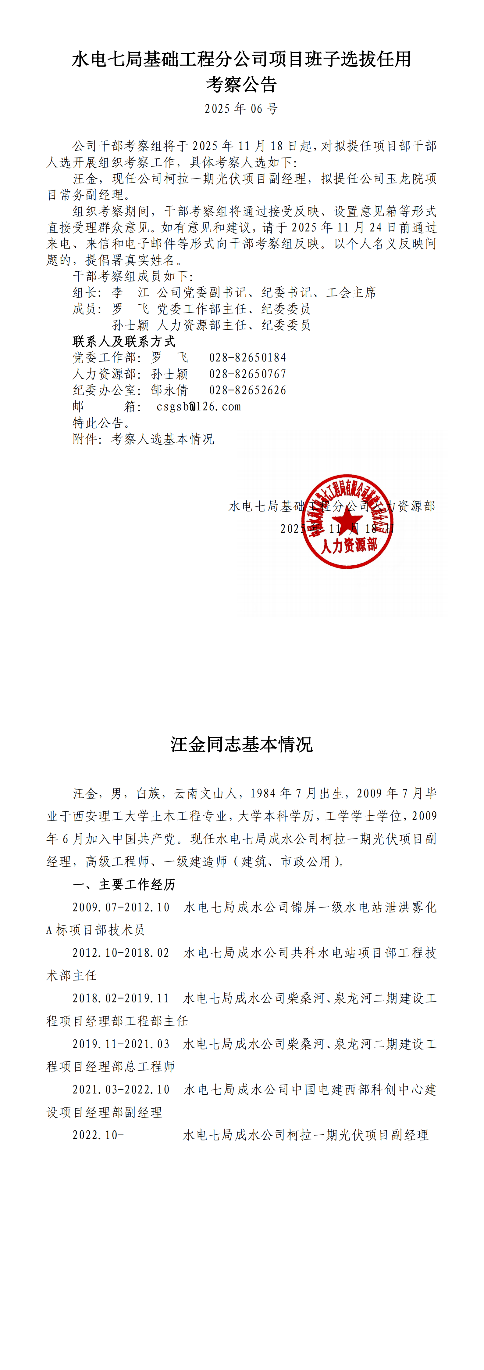 水电七局基础工程分公司项目班子选拔任用考察公告(2025年06号)