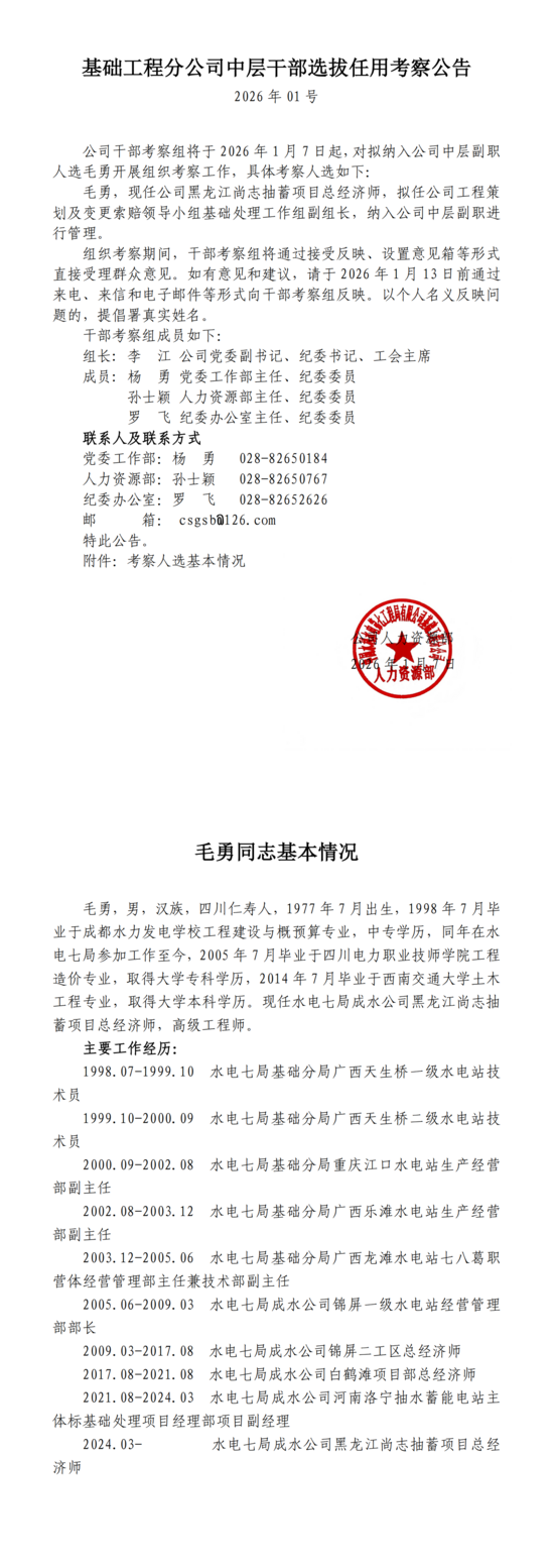 基础工程分公司中层干部选拔任用考察公告(2026年01号)