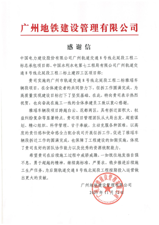 本网广州消息(曹爱宗 报道) 11月17日,水电七局广州轨道交通8号线北延段工程二标土建四工区收到业主感谢信,信上对雅瑶车辆段项目征拆工作圆满完成表示感谢。 信中指出,雅瑶车辆段项目跨越白云、花都两区,面临拆迁面积大、权益纠纷复杂等诸多挑战。在项目建设过程中,项目管理团队从大局出发,超前谋划、精心组织、科学管理、甘于奉献,主动克服各种困难,以高度的责任感和使命感全力配合开展征拆工作,最终促成雅瑶车辆段拆迁工作圆满完成,为工程建设如期实施筑牢根基,充分展现了出色的团队协作能力与优秀的资源统配能力。 下一步,项目部将继续发扬“自强不息、勇于超越”的企业精神,高标准、严要求稳步推进后续施工生产任务,为广州轨道交通8号线北延段工程按期投入运营贡献更大力量。(责任编辑 刘忆) 感谢信 | |