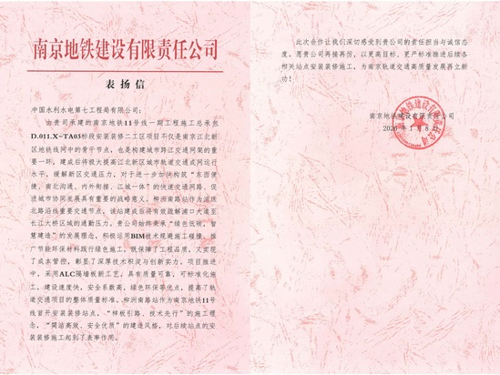 本网南京消息(蔡菁 报道)1月12日, 南京地铁11号线安装装修二工区项目收到南京地铁建设有限责任公司发来的表扬信,对项目团队在工程建设中展现出的技术实力与创新成果给予充分肯定和通报表扬。 在项目建设过程中,项目部全体人员迎难而上、科学组织,始终将安全质量放在首位,通过优化施工方案、强化过程管控、创新施工工艺,圆满完成了各项阶段性建设目标,为后续站点施工起到表率作用,得到业主方的高度肯定。 2026年为项目决胜关键期,项目全体员工将化部署为行动、促蓝图变实景,以更高目标、更严标准推进后续工程建设。(责任编辑 刘忆)