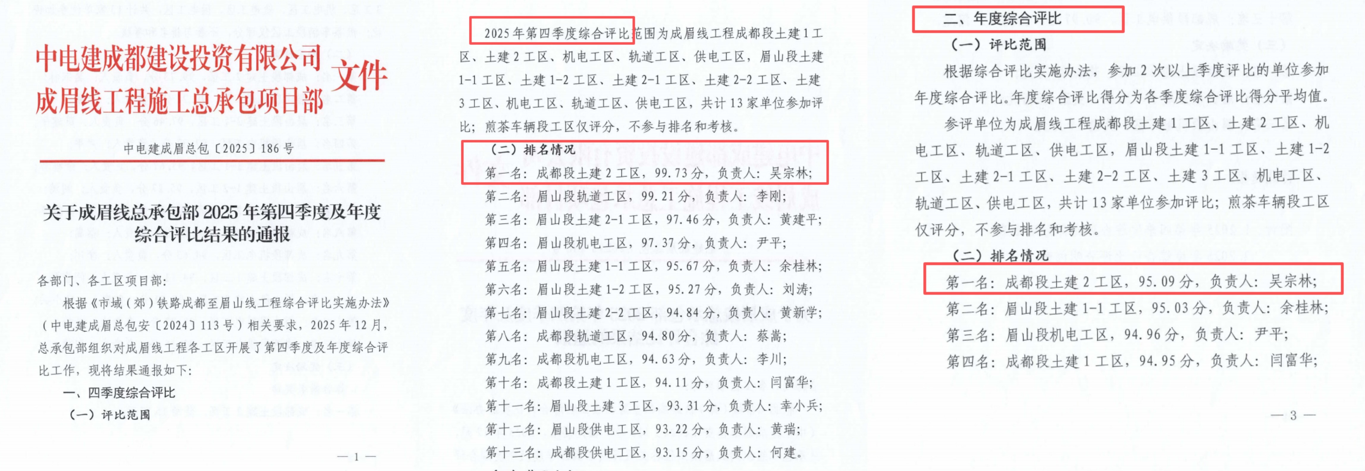 本网成都消息(钟玉洁 报道)1月4日,水电七局成眉线工程成都段土建2工区在成眉线施工总承包部第四季度及年度综合考核评比中均荣获第一名。 2025年,成都段土建2工区通过动态优化施工组织,合理调配人力物力,全力突破用地移交瓶颈;针对跨区域长战线管理难题,强化分段负责与统筹协调,提升现场执行效率;坚持网格化管理,全线嵌入16个管理网格,配备专人专责网格长等,健全风险分级管控与常态化巡查机制,实现安全生产零事故目标。工程安全、质量、进度等方面均得到了总承包部的高度认可,并在第四季度考核和年度综合评比中均荣获“第一”的称号。 项目部将继续保持昂扬斗志,展现铁军风采,以精益建造推动高质量发展,为打造精品工程、谱写发展新篇再立新功。(责任编辑 刘忆) 评比结果 | |