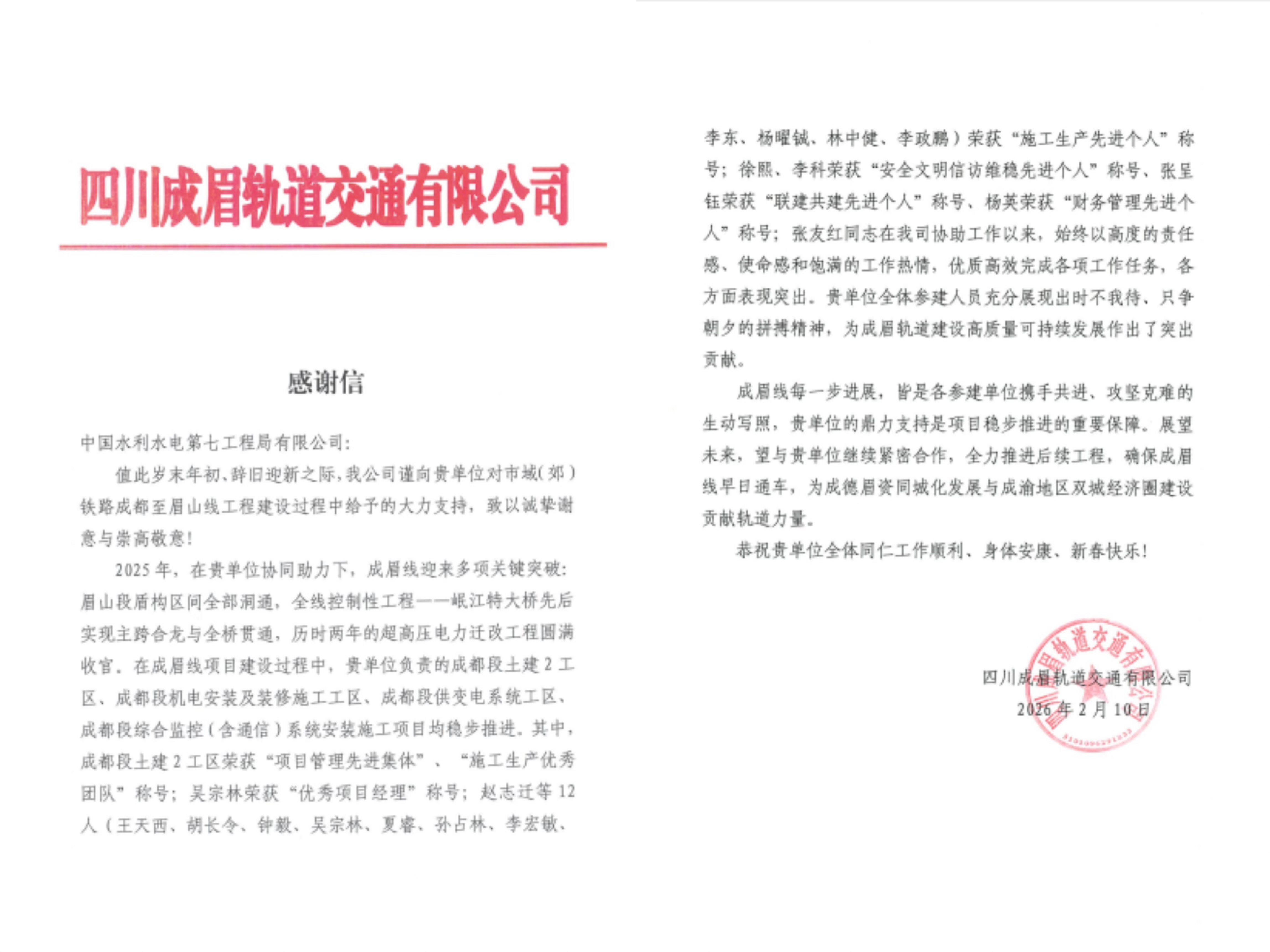 本网成都消息(余耀 报道)2月10日,水电七局成眉线项目收到业主感谢信。 信中指出,在成眉线项目建设过程中,水电七局负责的成都段土建2工区、成都段机电安装及装修施工工区、成都段供变电系统工区、成都段综合监控(含通信)系统安装施工项目均稳步推进,其中成眉线土建2工区荣获“项目管理先进集体”“施工生产优秀团队”称号,多名参建者荣获“施工生产先进个人”,全体参建人员充分展现出时不我待、只争朝夕的拼搏精神,为成眉轨道建设高质量可持续发展作出了突出贡献。 成眉线土建2工区项目表示,此次荣誉既是肯定,更是激励。下一步,项目团队将秉持高标准严要求,全力推进后续施工,为成德眉资同城化发展与成渝地区经济圈建设贡献七局力量。(责任编辑 刘忆) 感谢信 | |