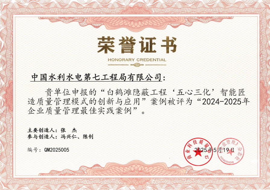 本网成都消息(梁俊霞 报道)9月19日,记者从商业科技质量中心获悉,公司申报的“白鹤滩隐蔽工程‘五心三化’智能匠造质量管理模式的创新与应用”案例被评为“2024-2025年企业质量管理最佳实践案例”。 “五心三化”智能匠造质量管理模式中,“五心”指敬业奉献坚守初心、精益求精专注恒心 、国之重器秉承匠心、品牌建设打造核心、科技驱动数字创“心”,“三化”指灌前分析精准化、隐蔽工程可视化、质量追溯清晰化。 近年来,公司高度重视质量管理工作,积极推广先进质量管理方法和经验,搭建诸多质量交流学习平台,在积极开展质量管理小组活动中不断提升工程管理水平、技术水平和工程质量,并取得了良好的经济效益和社会效益。(责任编辑 刘忆) 荣誉证书 | |